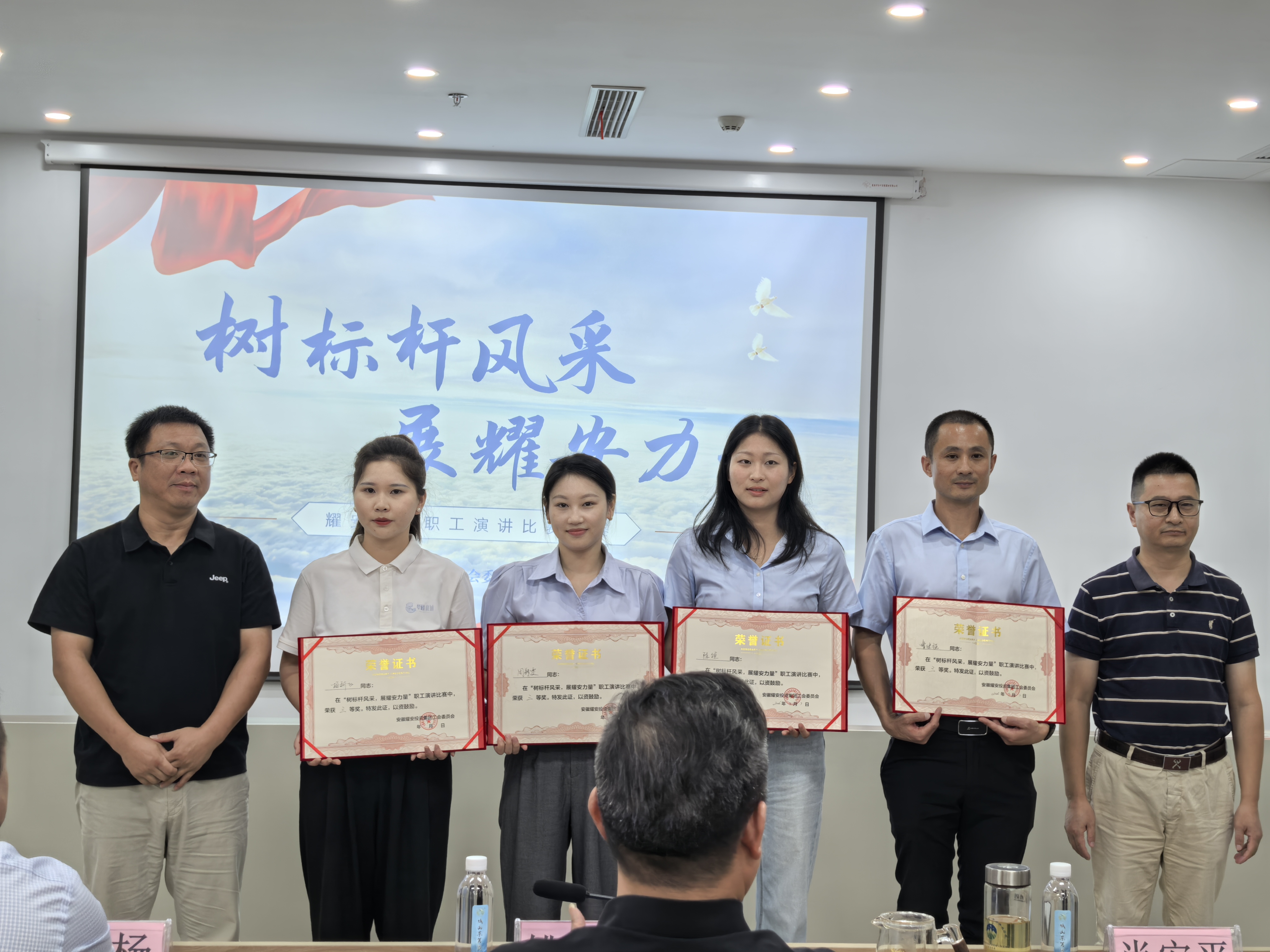 集團工會主席查全勝、人力資源部(績效考核辦)主任魯峰為杰出演說獎獲得者胡沛沛、錢浩、章程和董浩頒獎